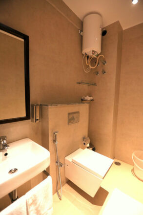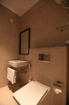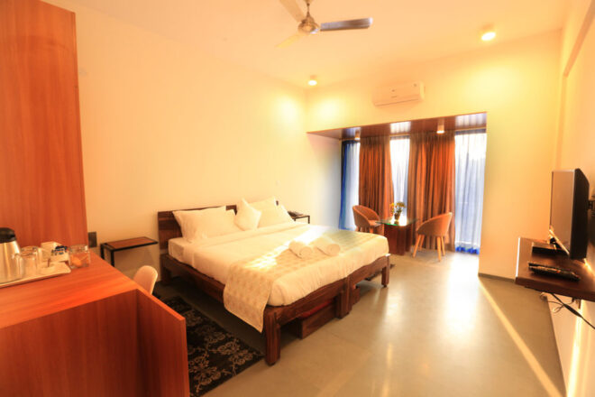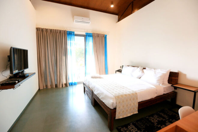 The fully furnished double bedroom features an LCD TV, air conditioning, table, and chair, attached modernized bathroom, overlooking the course or garden views.
